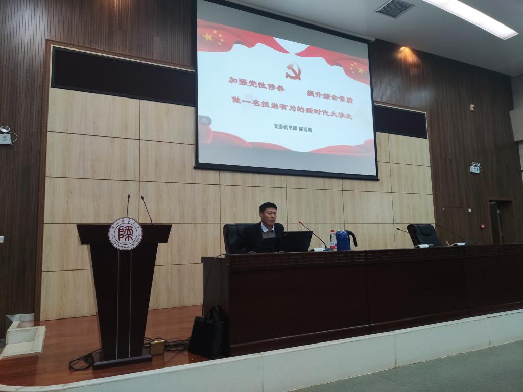 3月31日晚,万象城官网第34期入党积极分子培训班第五讲在文澜楼B段一层会议厅开讲。党委组织部组织员邱远航老师以《加强党性修养,提升综合素质》为题进行了授课。体育学院和awc777万象城娱乐官网百余名入党积极分子参加,培训班由学院党委组织员郭康凌主持。
