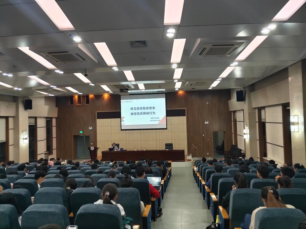 宋战良老师谈到,高校是党的意识形态的前沿阵地,肩负着学习研究宣传马克思主义、弘扬社会主义核心价值观、培养德智体美劳全面发展的社会主义合格建设者和可靠接班人的任务。紧接着,他从“什么是意识形态”、“网络意识形态安全出现的新情况新问题和表现形式”、“党员应做网络意识形态安全的坚决捍卫者”三方面进行深刻讲解。他指出,习近平总书记强调“建设具有强大凝聚力和引领力的社会主义意识形态,是全党特别是宣传思想战线必须担负起的一个战略任务。”增强凝聚力和引领力是立足新时代新使命,强化意识形态工作重要作用的两个重要着力点。通过列举近来发生的一系列真实事件,宋老师对网络意识形态出现的新情况、网络意识形态安全存在的突出问题及高校网络意识形态安全的表现形式进行了深层次地分析阐述。他强调意识形态关乎旗帜、关乎道路、关乎国家政治安全,党员干部在网络上要严守政治纪律和政治规矩,要严格规范自己的网络行为,积极履行举报监督的义务,争做主流网络意识形态的维护者、管理者和引导者。