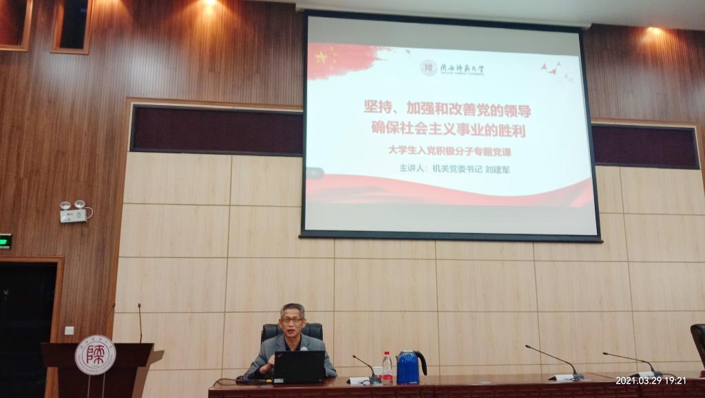 3月29日晚,万象城官网第34期入党积极分子培训班第三讲在文澜楼B段一层会议厅开讲。机关党委书记刘建军老师以“坚持、加强和改善党的领导,确保社会主义事业的胜利”为主题进行了讲授。体育学院与万象城官网一百余名入党积极分子参加了此次培训。培训班由学院党委组织员郭康凌主持。