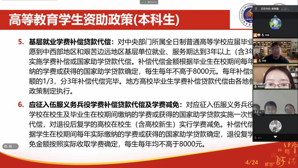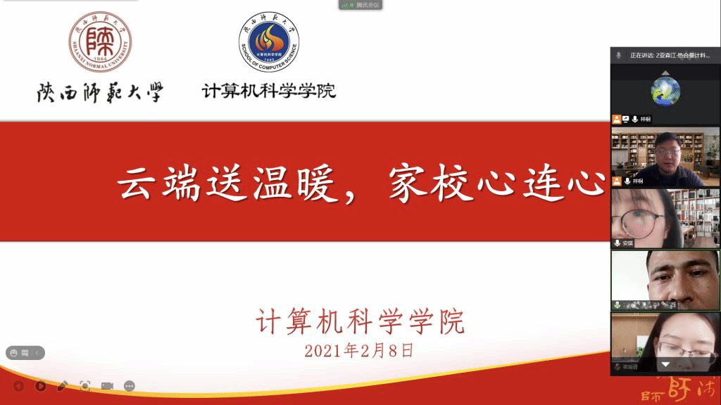 深冬时节,学子返乡,为进一步了解学生家庭情况,给学生送去学校的温暖与祝福,充分体现国家、学校对学生的关心关爱,帮助学生度过温馨祥和的寒假及新春佳节,深化资助育人成效,确保寒假期间资助工作不断线,在党委学工部(学生处)的指导与支持下,awc777万象城娱乐官网由党委副书记袁冰、团委书记郭康凌及辅导员毛庆、安琪、崔瑜璠和陈子桐组成走访小组,于2月8日通过腾讯会议开展“云端送温暖,家校心连心”寒假线上走访活动,活动由学院资助专干陈子桐主持。