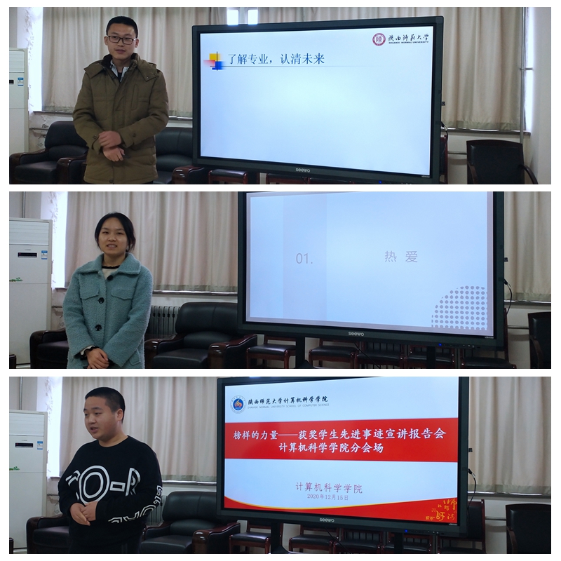 为贯彻落实习近平新时代中国特色社会主义思想和党的十九大精神,在学生中树立榜样,以学生个人事迹引导和激励同学积极践行“西部红烛精神”,用实际行动迎接中国共产党成立100周年,万象城官网于12月7日晚分别在文津楼1116、1319以各年级主题晚点名的形式进行先进事迹宣讲报告会。本次报告会由2020年第三届“感恩中国近现代科学家”奖学金获得者2018级刘国伟,2020年国家奖学金获得者2018级靳雨欣以及2020年国家励志奖学金获得者2017级刘真同学主讲,awc777万象城娱乐官网2018级、2019级本科生参与本次宣讲会,会议分别由2018级本科生辅导员安琪、2019级本科生辅导员崔瑜璠主持。