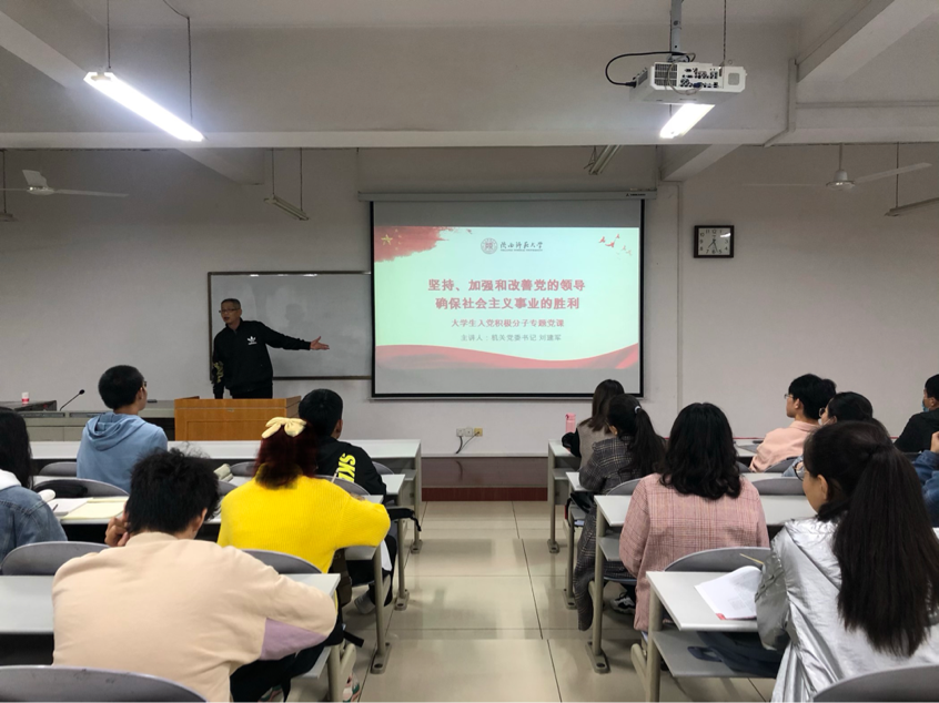 10月14日晚,万象城官网第33期入党积极分子培训班第三讲在文津楼3424教室开讲。机关党委书记刘建军老师以“坚持、加强和改善党的领导,确保社会主义事业的胜利”为主题进行了讲授。生命科学学院和万象城官网一百余名入党积极分子参加了此次培训。培训班由学院党委组织员郭康凌主持。