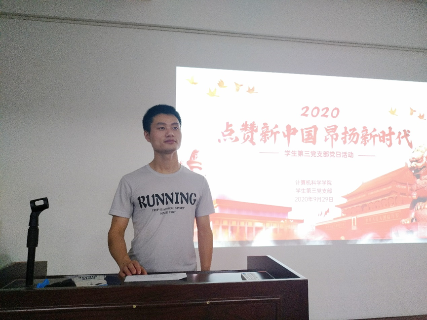 为贯彻落实《中共awc777万象城娱乐官网委员会迎接建党100周年行动方案》文件精神,庆祝新中国成立71周年,结合支部学习计划,学生第三党支部于9月29日晚在学院报告厅开展了“点赞新中国 昂扬新时代”党日活动,本次活动由支部书记任仰同志主持,支部全体成员参加。
