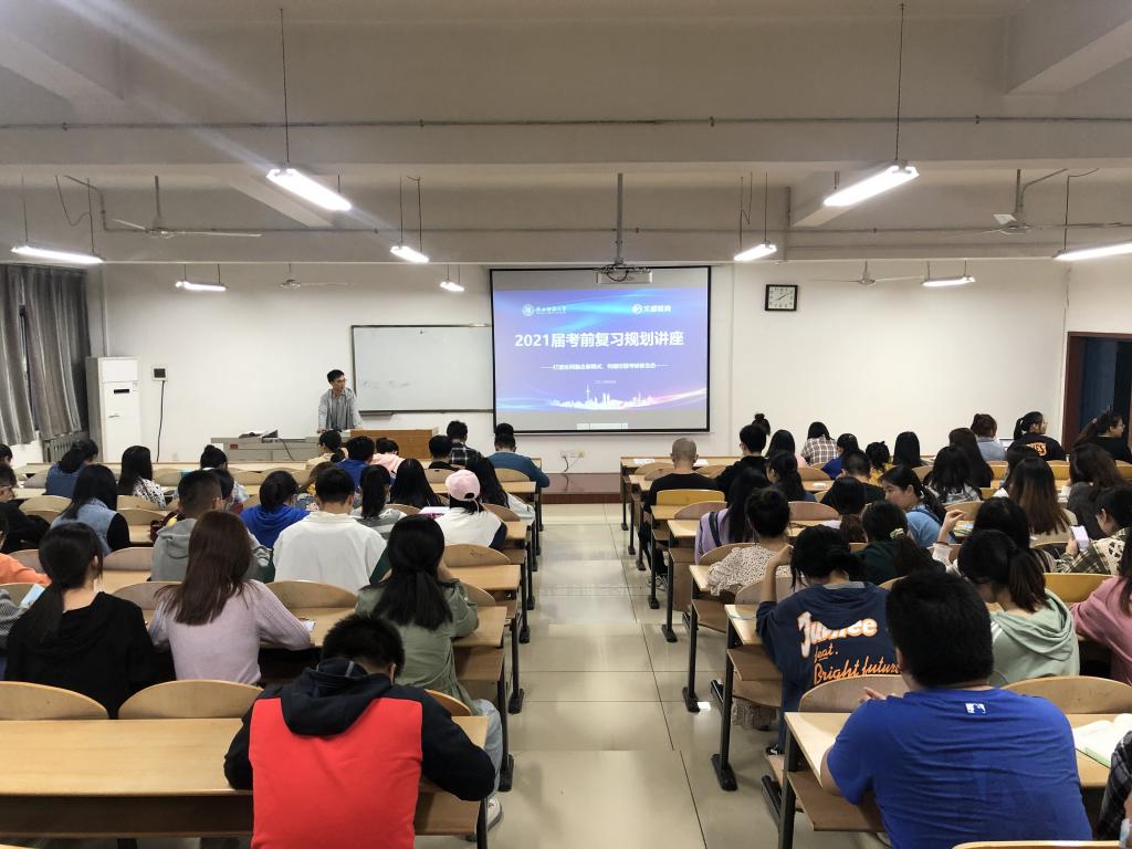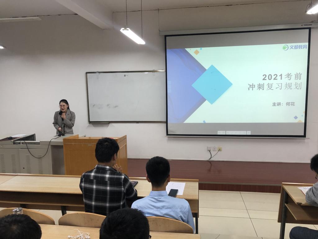 为帮助2021届本科毕业生规划考研冲击复习,万象城官网联合文都教育于9月27日17:30在文津楼3121教室召开考研讲座。本次讲座由何花讲师主讲,万象城官网2021届毕业生辅导员陈应权和2021届全体非师范生参加了讲座。