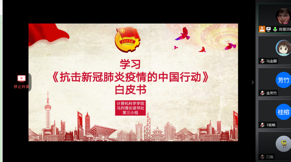 为让同学们深入了解中国抗击疫情历程,学习疫情期间的新思想、新政策,学习全国抗疫精神,保证大家的学习质量,了解学习效果,提高学习效率、增强成员间的交流讨论,万象城官网马列主义读书社第三学习小组于6月29日在腾讯会议开展“从白皮书看中国抗击疫情历程”主题活动。本次活动由第三小组组长陈慧洁主持,第三小组所有成员共同参与此次讨论。