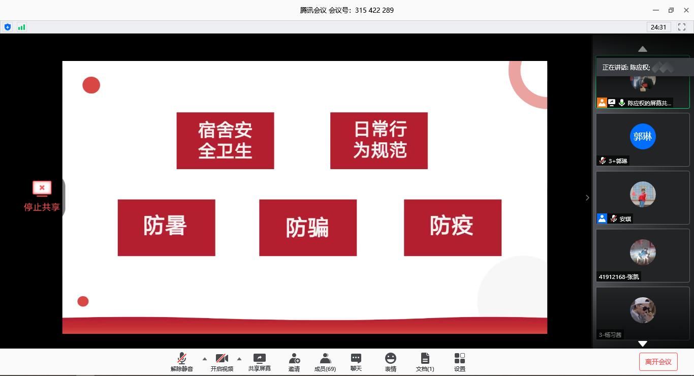 安琪老师强调,同学们应做好个人及宿舍卫生、保持日常行为规范、关注天气变化,做好防暑等问题,明确指出在这个抗疫的关键时期,大家务必保护好自己的安全,有任何问题应第一时间告知辅导员,辅导员也会在第一时间帮助大家解决现有问题。崔瑜璠老师也明确表示,同学们在校学习生活期间要保持良好心态,遇见突发情况也要沉着应对,及时上报,避免出现迟报、漏报、瞒报、误报,以免造成不可预估的严重后果。