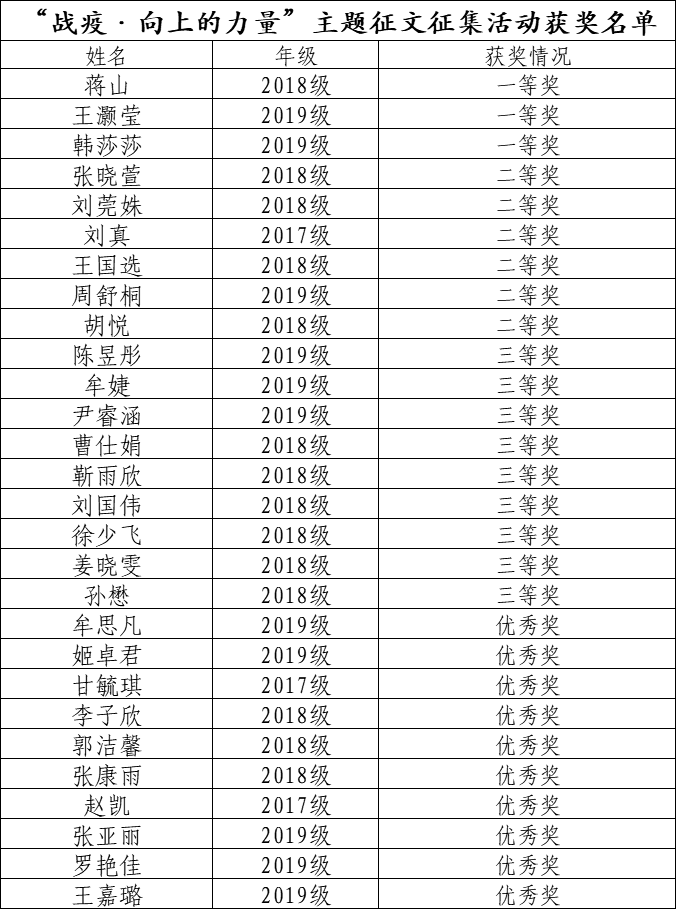 比赛最终评定蒋山同学《“破茧”的时光》、王灏莹同学《战疫青春》、韩莎莎同学《为了春回大雁归》3个作品获得一等奖,张晓萱同学《夜将逝》等6个作品获得二等奖,陈昱彤同学《战役》等9个作品获得三等奖,牟思凡同学等10位同学的作品获得优秀奖。学院将推送以上28篇作品参加校级比赛。本次征文大赛激励和引领广大团员青年进一步坚定制度自信,在党和人民最需要的地方贡献力量,引导团员青年思考榜样背后的精神力量。