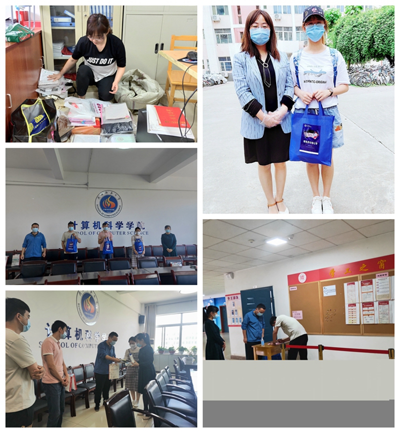 暖心服务,盼迎回家。此外,学院还为每一位返校精心准备了“计科学子返校安心包”,包括口罩、饭盒、免洗手凝胶、消毒喷壶等防疫物资,辅导员老师去往学生宿舍打扫卫生,晾晒被褥,进行消杀,确保学生返校后拥有一个安全卫生的生活环境。截止12日,万象城官网申请返校的学生已经全部安全到校,值得一提的是,两位学生因飞机延误导致到校时间较晚,本打算在校外住宿,辅导员毛庆在获悉情况后第一时间驾车到校外宾馆接回学生,开通返校“绿色通道”,为学生顺利办理返校入住手续。党委副书记袁冰和辅导员老师与返校学生进行了亲切座谈,关心学生假期学习和生活,叮嘱学生们返校后要遵守学生规定,在做好防疫工作的基础上,全心投入到学习中来,珍惜宝贵的大学时光,充实和提高自己。同时,为确保暂未返校学生的正常学习,毕业班辅导员为本科毕业生、研究生毕业生共计160余人次寄送就业资料、生活用品、复习材料、学习用具等物品,确保每一位同能居家安心学习。