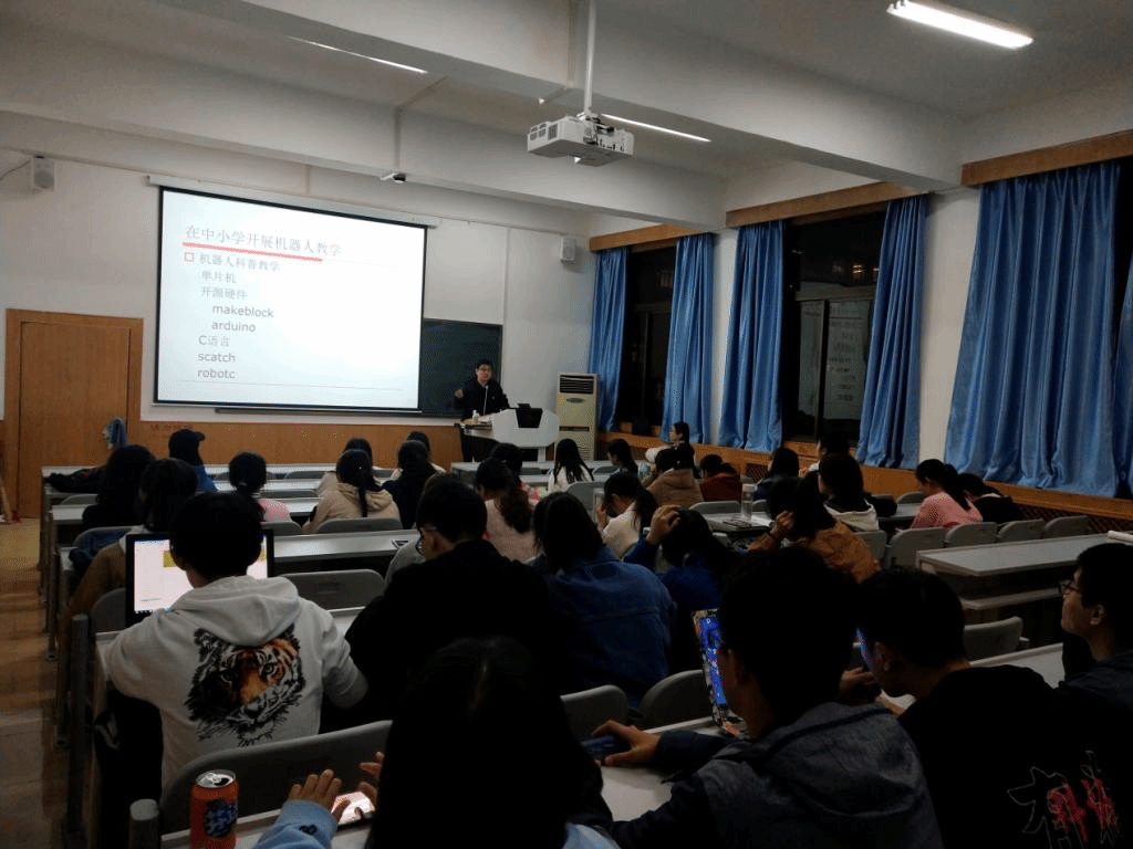 本次报告围绕韩老师在竞赛指导工作中的体会展开。韩老师在报告开始指出,做好信息技术教师的工作,首先要找到自己擅长的领域,根据自己的特长或者是兴趣爱好,将其与工作结合起来,最终做出有自己特色的工作。接着,韩老师重点介绍了当前与高中与信息技术课程相关的竞赛,如当前大热arduino 、 scatch 、 robotc等应用,他建议同学们可以根据当前趋势在大学阶段尝试接触相关知识,为以后的工作打下基础。随后,韩老师播放几段他带队参加国际青少年机器人竞赛的视频,让大家对比赛氛围、参赛队风采和比赛流程等都有了直观认知。最后韩老师与大家分享了他自2002年工作以来的心路历程,他提到不是每个优秀的人起初就具有优秀出众的能力,当处在一个位置上,即使本身不具有出众的实力,但如果肯坚持、慢慢磨练自己,就能够不断提高能力取得出色的成绩。他勉励在座的同学,不要因为觉得学习知识、学懂技术难而不肯去尝试,任何事情都是从零开始的,只要肯学,肯吃苦,就一定能慢慢将知识理清楚、转化成自身财富。随后,同学们就自己目前在学习中和职业规划中遇到的问题纷纷向韩老师进行提问,韩老师一一耐心解答。