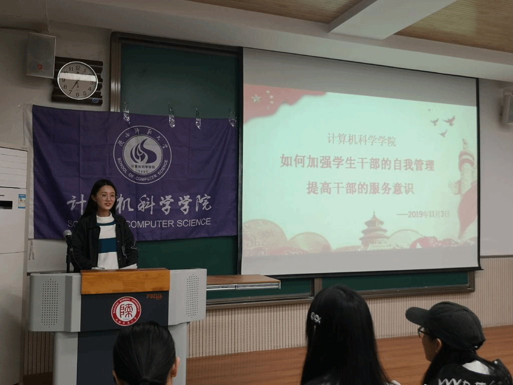 培训的最后,王越同学对于在场全体学生干部以及自身提出了期望。她希望学生干部能做到低调做人、高调做事,做有理想、有情怀、有担当的青年;能够高效工作,高效学习,充分发挥引领、表率、服务作用,为学院建设和学生发展作出贡献。