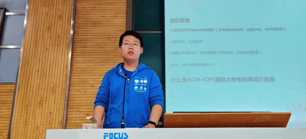 我校ACM集训队队长张国正与队员张静妍同学介绍了我校ACM竞赛队的比赛经历和获奖情况,同时结合学校的现实情况分析了参赛在专业素质提升方面的作用,使在场同学们对ACM有了一个全面的了解。