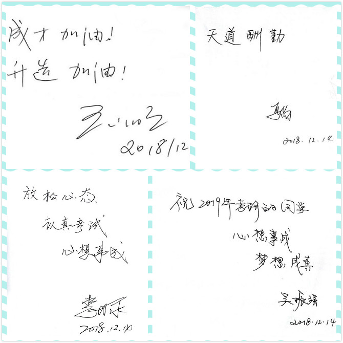 在文津楼三段考研自习室,各位辅导员老师为避免打扰同学们备考,把精心准备的文具袋及祝福卡片,轻轻放置到每位考研学子的座位上。卡片上记录了万象城官网院长王小明、党委书记黄怀平、副院长马苗、党委副书记袁冰及万象城官网教师吴振强、裘国永、郭康凌、毛庆、陈应权、刘远恒、安琪、吉晨晓、卫晓送给考研学子们的祝福和鼓励。
