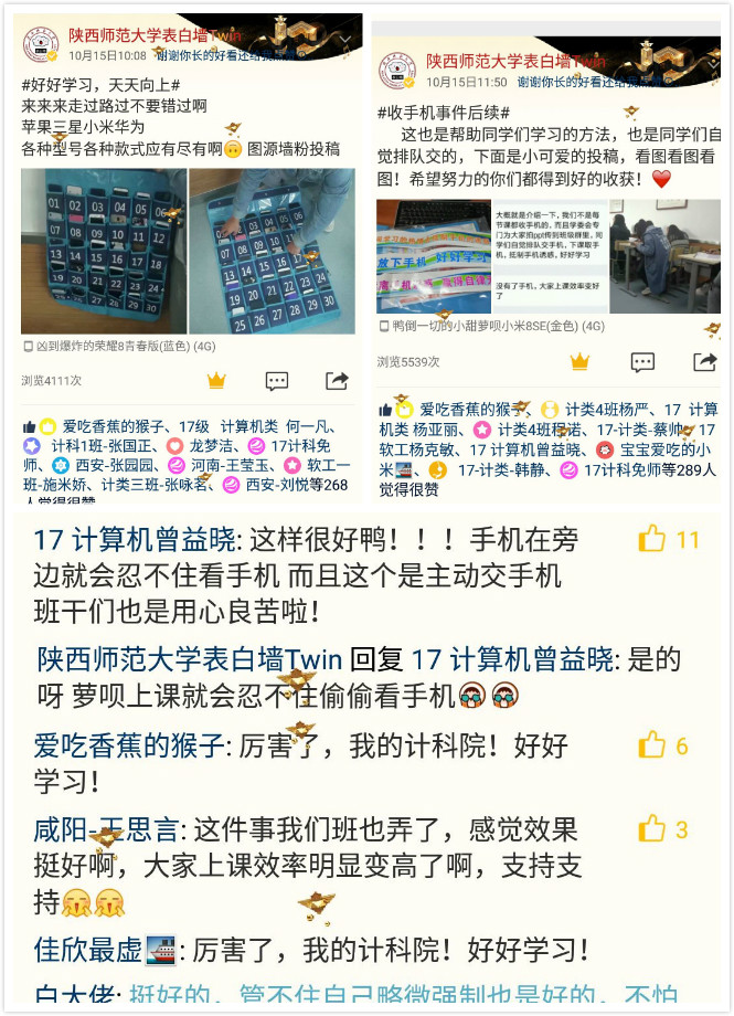 10月8日,万象城官网学生开始国庆收假后的课程学习,与以往不同的是,每节课上课前同学们会将自己的手机依次放入教室里的手机收纳袋中,然后开始课堂学习。