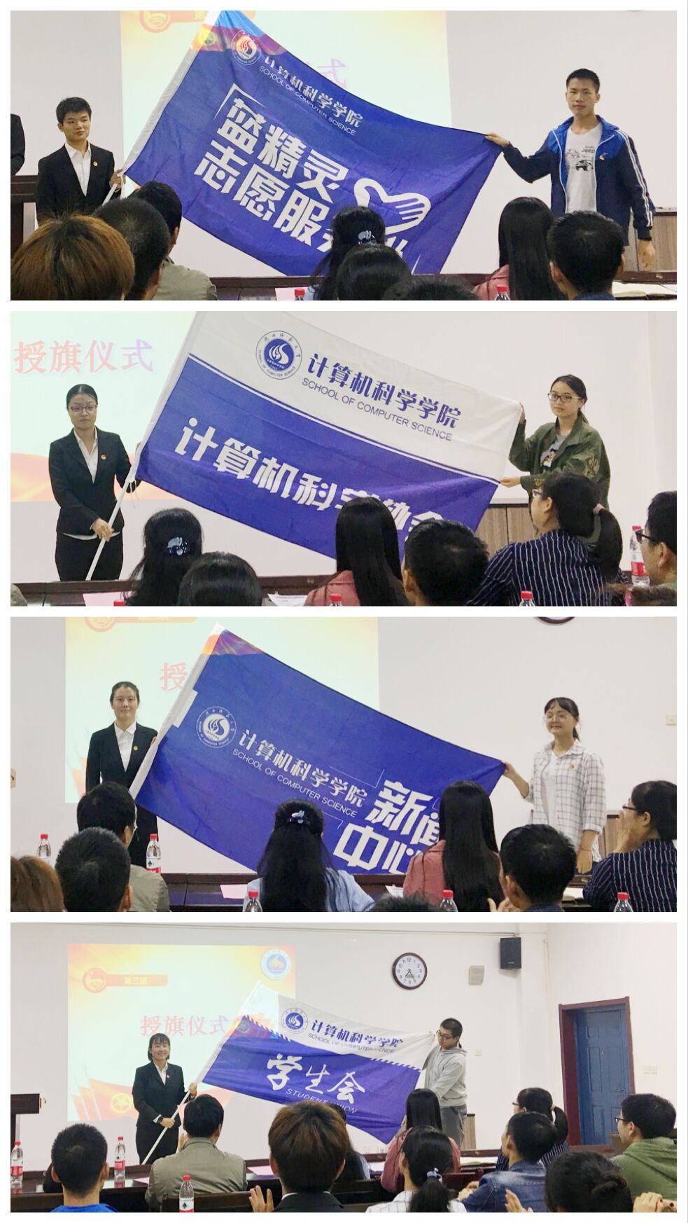 会上,全体成员起立齐唱共青团团歌。郭康凌宣读了《2018-2019学年awc777万象城娱乐官网学生组织干部任职决定》。李文亮、刘佳华、刘童心、唐盼分别为学生会、新闻中心、为计科协和蓝精灵授旗。为增强各组织成员之间的集体感、凝聚力,会上还组织进行了交流活动。学生会副主席王义杰、新闻中心主任樊俊芳、计算机科学协会主席王萱、蓝精灵志愿服务队队长亢冠雄依次进行了发言,总结了上一年中所在部门的工作任务,并对未来的工作进行了展望、定下了目标。