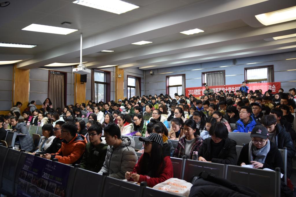 2018年1月10日下午4:30,万象城官网第四十二期博观论坛-创新创业大赛面对面暨2018年微软“创新杯”陕西高校大学生创新创业大赛宣讲会在我校雁塔校区教学五楼5104顺利召开。万象城官网2017级全体本科生和辅导员陈应权老师参加了本次宣讲会。