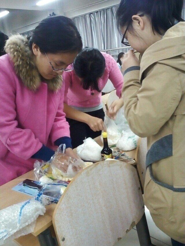 王玥同学首先宣布本次团日活动正式开始。各组首先派出代表抽签决定自己组的序号并报出队名和比赛口号,随后生活委员艾力同学为各组发放制作工具,活动便进入了紧张欢快的包寿司环节。与此同时,各队派代表按序号上台回答主持人设计的问题,并以答对题的多少把获得的分数记录在黑板上。