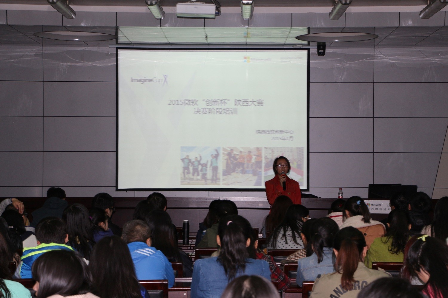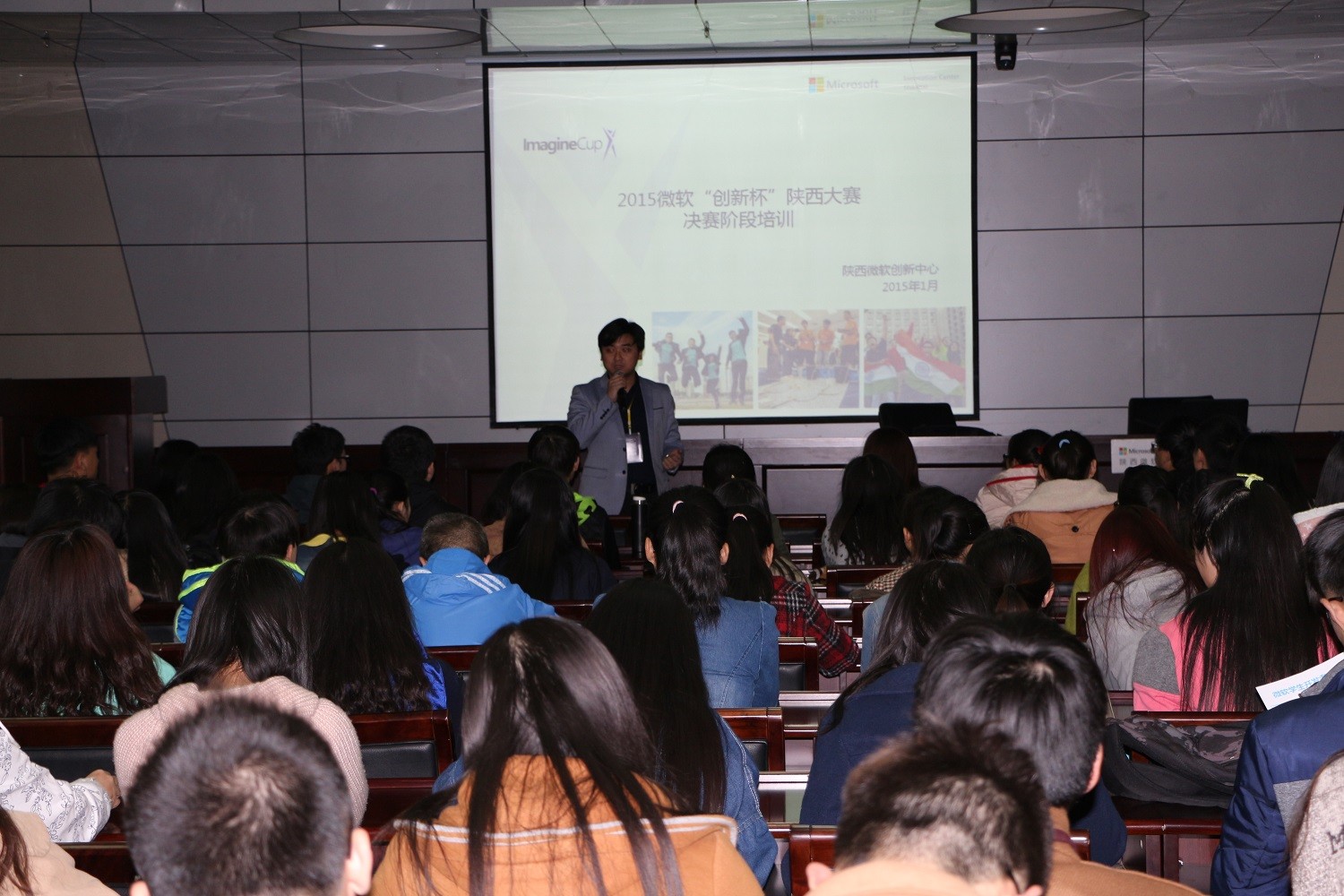 在讲座正式开始前,陕西微软创新中心的老师为大家展示了微软体感技术的相关视频,让大家对于微软最新体感技术有了初步的了解。随后,微软创新中心的市场部经理符泽轩为大家介绍了创新杯大赛复赛阶段的具体流程,参赛者需要准备的复赛资料,以及创新杯后阶段的计划与安排。同时,他向大家展示了去年微软创新杯的优秀作品视频,鼓励大家发散思维,勇于尝试,大胆创新。接下来,微软创新中心的特聘讲师马卫卫为大家现场演示了有关kinect体感产品的人体骨骼取样和动作分析,并对相关的代码做出了解释。马老师还通过视频向大家展示了kinect的具体应用,让现场的同学们大开眼界。最后,马老师和符经理对大家的提问做出了详细解答,鼓励大家发挥想象力,结合实际共同思考更加丰富的体感应用。