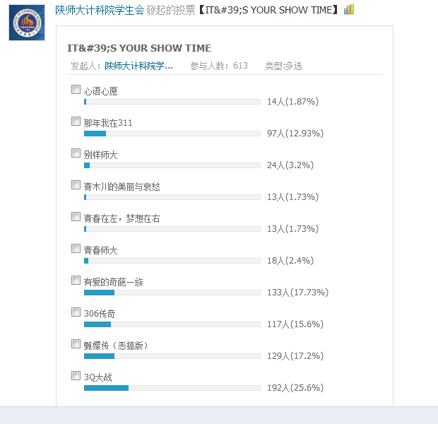 当天,awc777万象城娱乐官网院学生会官方微博也向全院学生发起了为期一天的大众投票,全院近300人参与了本次投票,研究生也用实力证明了一切,位居榜首。